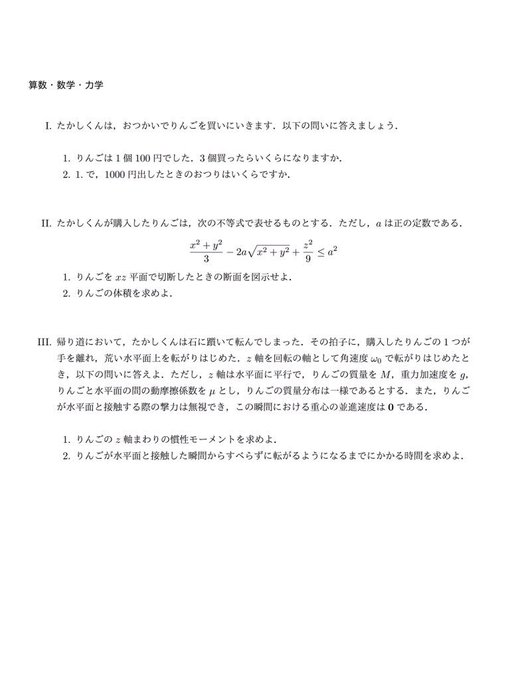 さてたかしくんは何ポイント獲得できたでしょうか。(答えは問題4の後) 問題2 回答 1000ポイント ①通常楽天市場での買い物は 1% のポイントがもらえます。 ②楽天カード払いは 2% のポイントがも問題 たかしくんの帰宅時間を答えなさい BakaNewsJP 41 Posted by u/willstillask 2 years ago Archived 問題設定 算数の問題で良く出る(本当かは知らん)みんな大好きたかしくんを今回は使います。 たかしくんスペック ・たかしくんは強いので海を渡れます。 ・たかしくんは強いので山があろうが谷があろうが一定の速度で走れます。